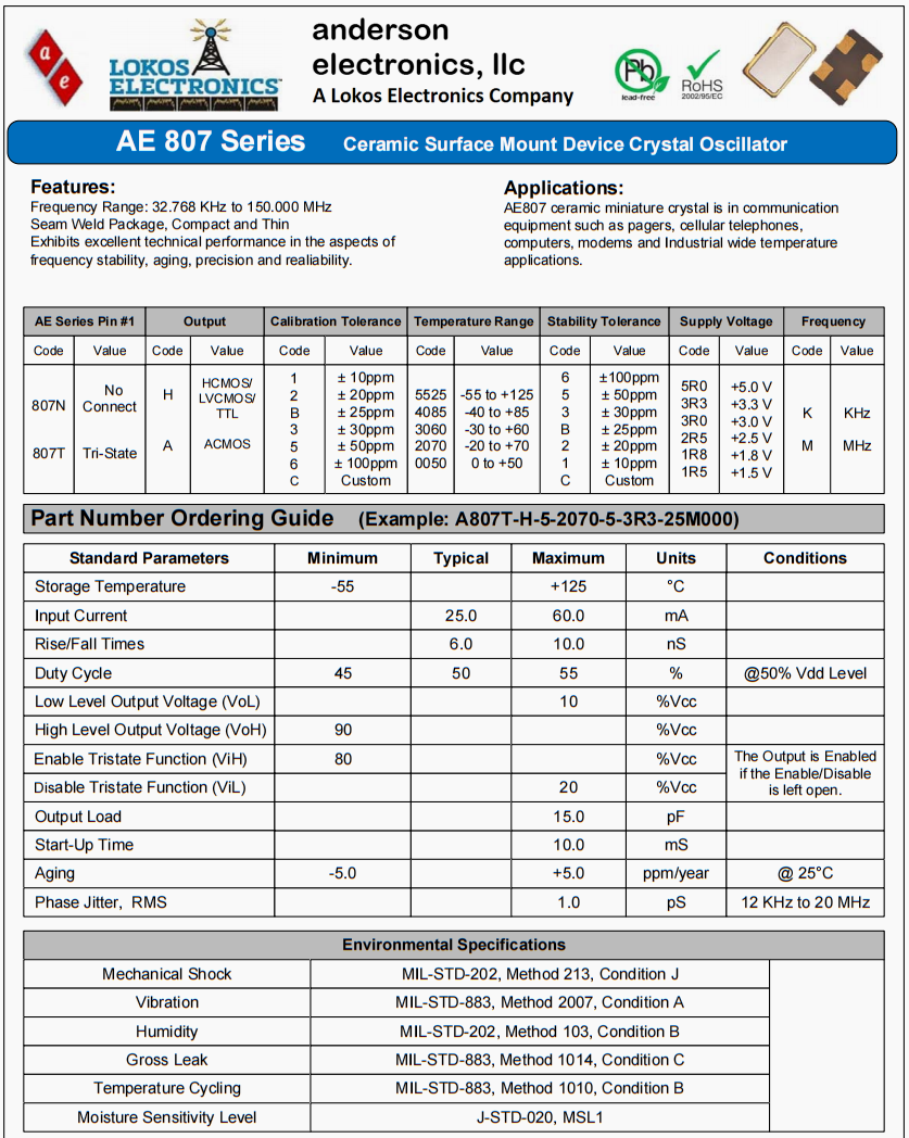 A807N-A-1-5525-1-1R5-24M000進口晶振,安德森環保無鉛晶振,AE807數碼相機晶振