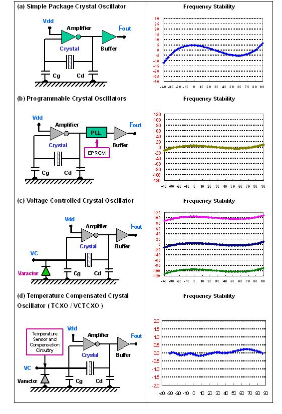 在(圖)提供了數種石英振蕩器輸出頻率對溫度變化的穩定性示義圖