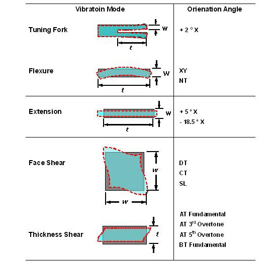 經由不同的石英切割角度及不同電極型狀的電場效應, 石英芯片展現了各種不同的振動模態. "1TJF090DP1A000A"以經常產生的振動模態可以概分為擾曲模態(flexure mode), 伸縮模態(extension mode), 面剪切模態(face shear mode) 和 厚度剪切模態(thickness shear mode). 這幾種振動模態以簡單的方法在表一中可以看到. 在實際狀況中, 石英芯片并不是一定祇有單一種振動模態, 而可能有多種模態同時存在在一個石英芯片的振蕩中, 經由適當的設計, 可以壓制其它不希望產生的振動模態(unwanted mode), 來達到主要振動模態的最佳化.