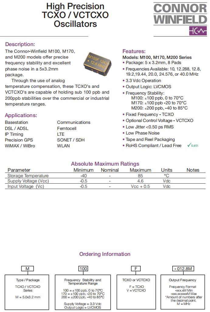M170V-019.44M|進(jìn)口壓控溫補晶振|6G無線通信晶振,ConnorWinfield晶振,M170有源晶振,M170V-019.44M晶振,進(jìn)口壓控溫補晶振,5032mm晶振,頻率19.44MHz,電壓3.3V,工作溫度-20~70°C,頻率穩(wěn)定性100ppb,低抖動晶振,低相噪晶振,6G無線通信晶振,精密GPS導(dǎo)航系統(tǒng)晶振,基站應(yīng)用晶振,無線局域網(wǎng)晶振,Femtocell晶振.