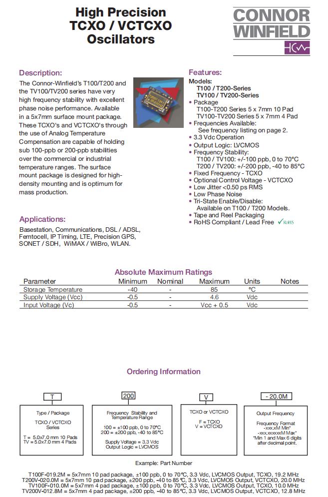T200V-020.0M|VC-TCXO晶振|6G基站晶振,ConnorWinfield晶振,T200V有源晶振,T200V-020.0M晶振,VC-TCXO晶振,石英晶體振蕩器,7050mm晶振,頻率20MHz,電壓3.3V,工作溫度0~70°C,頻率穩(wěn)定性100ppb,低相噪晶振,高可靠性晶振,6G基站晶振,通信設(shè)備晶振,DSL / ADSL晶振,精密GPS晶振,無線網(wǎng)絡(luò)晶振,SONET/SDH設(shè)備晶振.