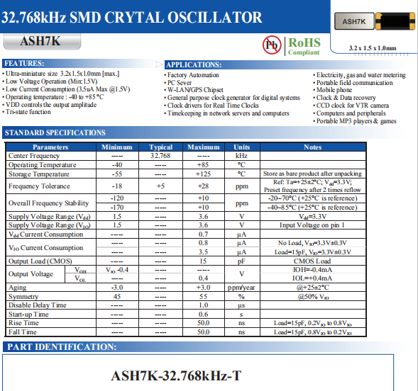 ABRACON晶振,ASH7K晶振,有源晶體振蕩器.小型表面貼片晶振型,是標準的石英晶體振蕩器,適用于寬溫范圍的電子數碼產品,家電電器及MP3,MP4,播放器,單片機等領域.可對應32.768KHZ以上的頻率,在電子數碼產品,以及家電相關電器領域里面發揮優良的電氣特性,滿足無鉛焊接的回流溫度曲線要求.