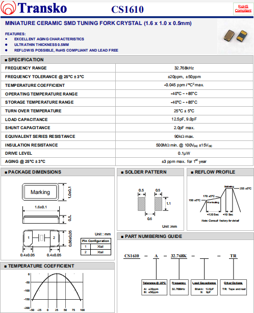 Transko晶振,CS1610晶振,進口音叉石英晶體.超小型,薄型,質地輕的表面貼片音叉型石英晶體諧振器,手機晶體,產品體積小,特別適用于各種小巧的便攜式消費電子數碼產品,在移動通信領域得到了廣泛的應用,晶振產品本身可發揮優良的電氣特性,滿足無鉛焊接的高溫回流溫度曲線要求.