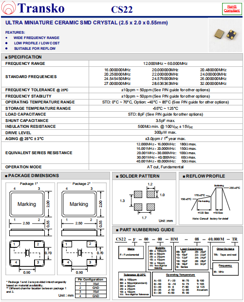 Transko晶振,CS22晶振,進(jìn)口貼片晶振.小型貼片石英晶振,外觀尺寸具有薄型表面貼片型石英晶體諧振器,特別適用于有小型化要求的市場(chǎng)領(lǐng)域,比如智能手機(jī),無(wú)線藍(lán)牙,平板電腦等電子數(shù)碼產(chǎn)品.晶振本身超小型,薄型,重量輕,晶體具有優(yōu)良的耐環(huán)境特性,如耐熱性,耐沖擊性,在辦公自動(dòng)化,家電相關(guān)電器領(lǐng)域及Bluetooth,Wireless LAN等短距離無(wú)線通信領(lǐng)域可發(fā)揮優(yōu)良的電氣特性,滿足無(wú)鉛焊接的回流溫度曲線要求.
