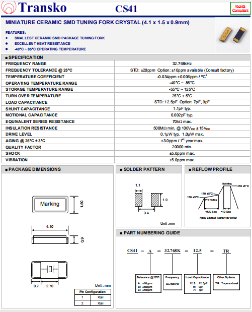 Transko晶振,CS41晶振,音叉晶體.貼片壓電石英晶體,體積小,焊接可采用自動(dòng)貼片系統(tǒng),產(chǎn)品本身小型,表面貼片晶振,特別適用于有小型化要求的電子數(shù)碼產(chǎn)品市場(chǎng)領(lǐng)域,因產(chǎn)品小型,薄型優(yōu)勢(shì),耐環(huán)境特性,包括耐高溫,耐沖擊性等,在移動(dòng)通信領(lǐng)域得到了廣泛的應(yīng)用,晶振產(chǎn)品本身可發(fā)揮優(yōu)良的電氣特性,滿足無鉛焊接的高溫回流溫度曲線要求.