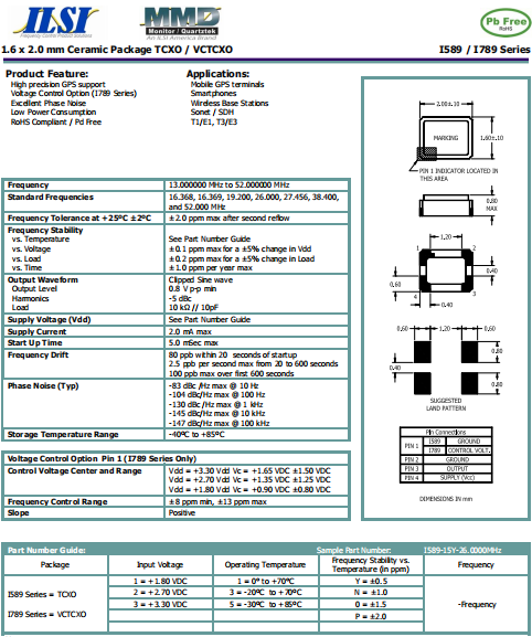ILSI晶振,I789晶振,壓控溫補晶體振蕩器.智能手機晶振,產品具有高精度超小型的表面貼片型石英晶體振蕩器,最適用于移動通信終端的基準時鐘等移動通信領域.比如智能手機,無線通信,衛星導航,平臺基站等較高端的數碼產品,晶振本身小型,薄型具備各類移動通信的基準時鐘源用頻率,貼片晶振具有優良的電氣特性,耐環境性能適用于移動通信領域,滿足無鉛焊接的高溫回流溫度曲線要求.