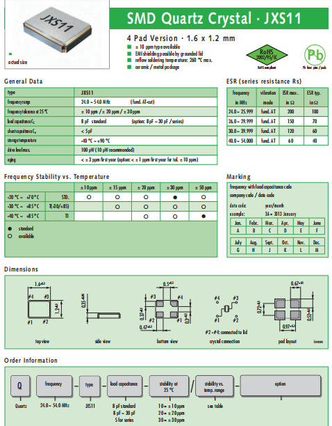 JAUCH晶振,JXS11晶振,耐高溫晶體諧振器.貼片石英晶體,體積小,焊接可采用自動貼片系統,產品本身小型,表面貼片晶振,特別適用于有小型化要求的電子數碼產品市場領域,因產品小型,薄型優勢,耐環境特性,包括耐高溫,耐沖擊性等,在移動通信領域得到了廣泛的應用,晶振產品本身可發揮優良的電氣特性,達到了無鉛焊接的高溫回流溫度曲線的標準.