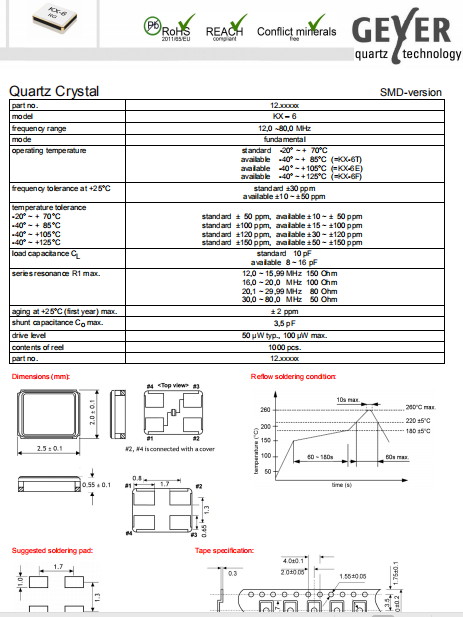 Geyer晶振,KX-6晶振,SMD石英晶體諧振器.普通石英晶振,外觀完全使用金屬材料封裝的,產(chǎn)品本身采用全自動(dòng)石英晶體檢測儀,以及跌落,漏氣等苛刻實(shí)驗(yàn).產(chǎn)品本身具有高穩(wěn)定性,高可靠性的石英晶體諧振器,焊接方面支持表面貼裝,外觀采用金屬封裝,具有充分的密封性能,晶振本身能確保其高可靠性,采用編帶包裝,可對(duì)應(yīng)產(chǎn)品應(yīng)用到自動(dòng)貼片機(jī)告訴安裝,滿足無鉛焊接的高溫回流溫度曲線要求.
