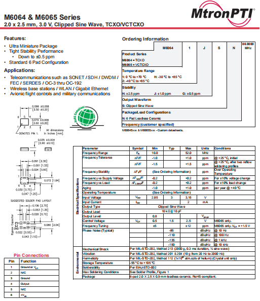 MTRONPTI晶振,M6065晶振,VC-TCXO晶振.2520mm體積的晶振,可以說是目前小型數(shù)碼產品的福音,目前超小型的智能手機里面所應用的就是小型的石英晶振,該產品最適用于無線通訊系統(tǒng),無線局域網,已實現(xiàn)低相位噪聲,低電壓,低消費電流和高穩(wěn)定度,超小型,質量輕等產品特點,產品本身編帶包裝方式,可對應自動高速貼片機應用,以及高溫回流焊接(產品無鉛對應),為無鉛產品.