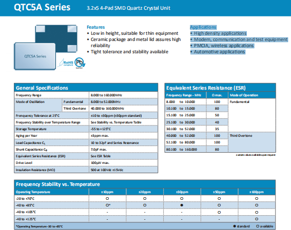 Quarztechnik晶振,QTC5A晶振,高質量石英晶體.小體積貼片5032晶振,外觀小型,表面貼片型石英晶體諧振器,因本身體積小等優勢,適用于移動通信終端的基準時鐘等移動通信領域.小型,薄型,輕型(5.0×3.2×0.8mmtyp.)具備優良的耐環境特性及高耐熱性強.滿足無鉛焊接的回流溫度曲線要求.