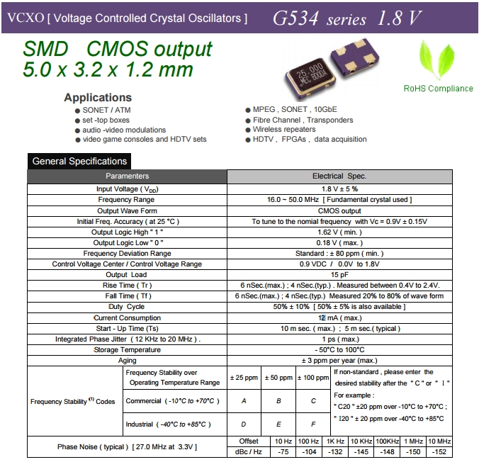 MERCURY晶振,壓控晶振,G534晶振,瑪居禮有源晶體振蕩器.VCXO是指這款晶體產(chǎn)品控制功能只有單壓控也就是電壓控制功能,產(chǎn)品本身頻率精度可以隨著電壓搞定起伏來自動調(diào)整頻率,使產(chǎn)品永遠控制在一定的頻率范圍,壓控晶振(VCXO)壓控石英晶體振蕩器基本解決方案,PECL輸出,輸出頻率60 MHz到200 MHz之間,出色的低相位噪聲和抖動,三態(tài)功能,應(yīng)用:SDH/ SONET,以太網(wǎng),基站,筆記本晶振應(yīng)用, VCXO,壓控晶體應(yīng)用:調(diào)制解調(diào)器,ADSL網(wǎng)絡(luò)控制器,無線基站,程控交換設(shè)備智能手機,筆記本晶振等.