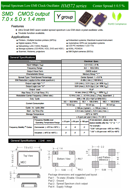 MERCURY晶振,瑪居禮振蕩器,HM572Y石英振蕩子.小型SMD有源晶振,從最初超大體積到現(xiàn)在的7050mm,有著翻天覆地的改變,體積的變小也試產(chǎn)品帶來了更高的穩(wěn)定性能,接縫密封石英晶體振蕩器,精度高,覆蓋頻率范圍寬的特點,SMD高速自動安裝和高溫回流焊設計,Optionable待機輸出三態(tài)輸出功能,電源電壓范圍:1.8V?5 V,高穩(wěn)定性,低抖動,低功耗,主要應用領(lǐng)域:無線通訊,高端智能手機,平板筆記本W(wǎng)LAN,藍牙,數(shù)碼相機,DSL和其他IT產(chǎn)品的晶振應用,三態(tài)功能,PC和LCDM等高端數(shù)碼領(lǐng)域,符合RoHS/無鉛.