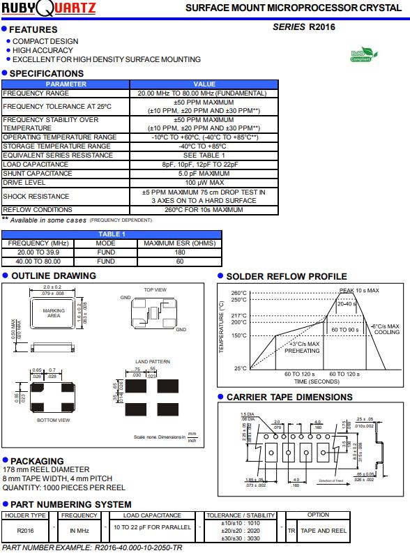 R2016貼片諧振器,Rubyquartz高質(zhì)量晶體,R2016-20.000-10-2050-TR晶振,貼片晶振本身體積小,超薄型石英晶體振蕩器,特別適用于有目前高速發(fā)展的高端電子數(shù)碼產(chǎn)品,因為晶振本身小型化需求的市場領(lǐng)域,小型,薄型是對應(yīng)陶瓷振蕩器(偏差大)和普通的石英晶體振蕩器(偏差小)的中間領(lǐng)域的一種性價比較出色的產(chǎn)品.產(chǎn)品廣泛用于筆記本電腦,無線電話,衛(wèi)星導(dǎo)航SSD,USB,Blu-ray等用途,符合無鉛焊接的高溫回流焊曲線特性.