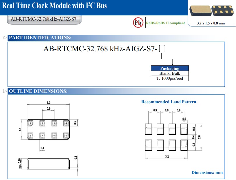 AB-RTCMK系列編碼AB-RTCMC-32.768kHz-AIGZ-S7,I2C總線實時時鐘模塊,小體積晶振尺寸3.2x1.5mm石英晶體振蕩器