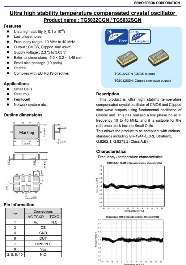 | X1G005241001400 | TG5032SGN | 10.000000 MHz | 5.00 x 3.20 x 1.45 mm | Clipped sine wave | 3.135 to 3.465 V | +/-1.0 ppm | -40 to ++85 °C |
