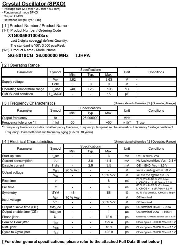 | X1G005601004400 | SG-8018CG | 26.000000 MHz | 2.50 x 2.00 x 0.80 mm | CMOS | 1.620 to 3.630 V | -40 to 105 °C | +/-50 ppm | ≤ 4.4 mA |