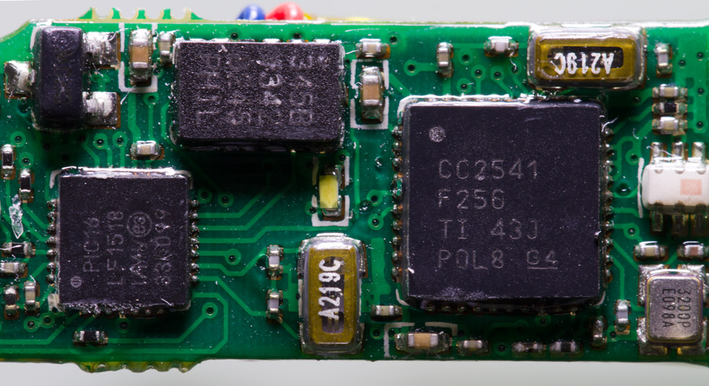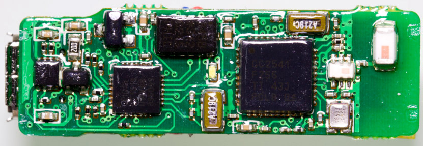 現在就來拆拆手環主機了,由于手環外殼采用熱熔接方式,要拆開手環只能采用暴力方式拆解.揭開外殼,可以看到智能手環主機電路板和零件,從MicroUSB膠塞固定位置上可以看到膠塞頭并沒有完全密封起來,如果游泳時帶著這個手環進入水中可能會導致進水.
