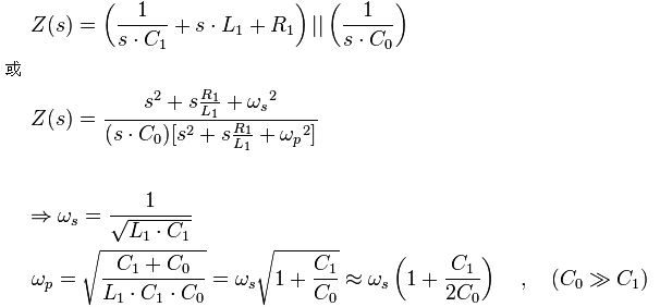 個(gè)頻率接近但特性不同的共振點(diǎn):低阻抗的串聯(lián)共振點(diǎn)與高阻抗的并聯(lián)共振點(diǎn)。 運(yùn)用拉普拉斯轉(zhuǎn)換,該等效電路網(wǎng)絡(luò)的阻抗可以寫(xiě)成以下數(shù)學(xué)式: