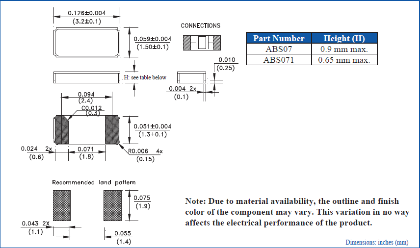 | ABS07-120-32.768KHZ-T | Abracon LLC | ABS07 | kHz Crystal | 32.768kHz | 2-SMD, No Lead | 0.126" L x 0.061" W (3.20mm x 1.50mm) | 0.035" (0.90mm) |
