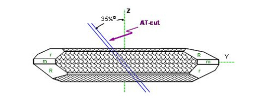 在各種不同種類的切割角度方式中, AT角度切割的石英芯片適用在數MHz到數佰MHz的頻率范圍,是石英芯片應用范圍最廣范及使用數量最多的一種切割應用方式. 在(圖五)中, 從石英晶棒X-軸向的上視圖, 可以看到對Z-軸向旋轉約35度的AT 方向. 這在大量生產的技術上也是很好達成的一種作業方式.