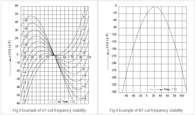 根據(jù)曲線的形狀,將晶體的頻率溫度特性分為2類.一個是三次曲線,另一個是二次曲線.典型的頻率溫度特性和BT削減在圖3和圖4所示,分別.在切晶體單元中最廣泛使用的是因為它們在室溫范圍內(nèi)產(chǎn)生較小的頻率變化響應(yīng)溫度變化.