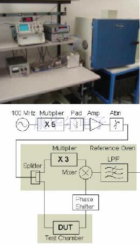 從一開始就意識到,由于室內環境溫度的變化,測試臺部件,測試設備和電纜的溫度系數會產生重大的測量問題.為了最大程度地減少這些問題,對參考頻率功率分配器,參考乘法器和相位比較混頻器以及低通濾波器進行了烘箱處理(圖3).