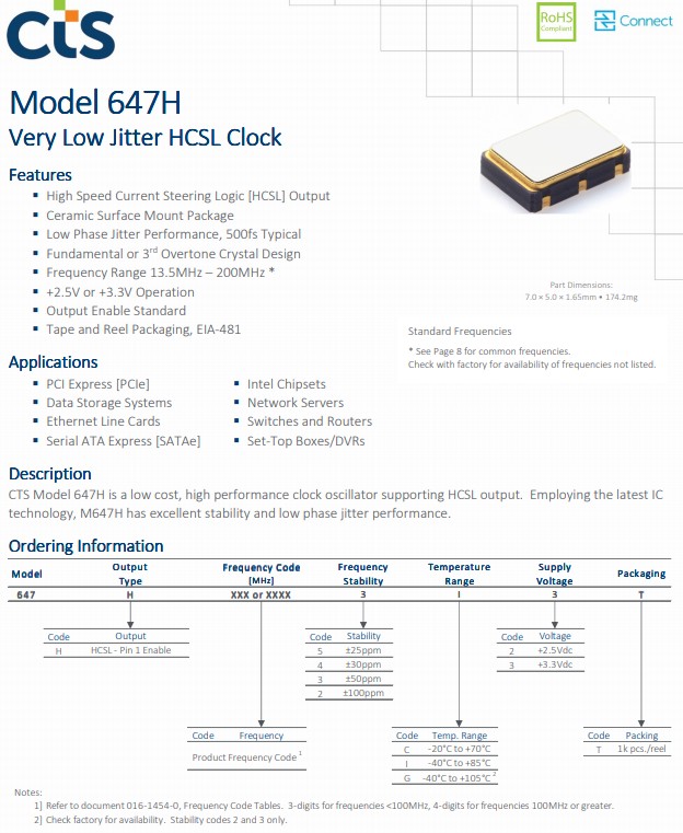 CTS Models 643H, 645H and 647H offer stability options of ±20, ±25, ±30, ±50 and ±100ppm, input voltages at +2.5V or +3.3V and typical phase jitter performance of <500fs. Along with standard commercial and industrial temperature range options, these new models also support the extended range of -40°C to +105°C for fan-less applications. Standard product features, common market applications and new series platforms are summarized below. Please refer to individual data sheets on the CTS website to view more performance characteristics.