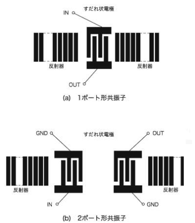 圖三顯示了SAW諧振器的基本結(jié)構(gòu),通過叉指電極之間產(chǎn)生駐波并增加電極數(shù)量,可以實現(xiàn)具有高Q的諧振器。圖四所示,SAW諧振器具有(a)單端口諧振器和(b)雙端口諧振器。單端口型石英晶體諧振器中心簾狀電極與設(shè)置在任一側(cè)上的結(jié)構(gòu),以產(chǎn)生駐波的反射器是由叉指電極,諧振器會激勵反射器表面反射的。它主要應(yīng)用于使用高Q的諧振器和窄帶濾波器。雙端口型諧振器本身是窄帶濾波器結(jié)構(gòu),將用于所述高Q的振蕩器,高頻帶的窄帶濾波器比單端口型諧振器更優(yōu)越。